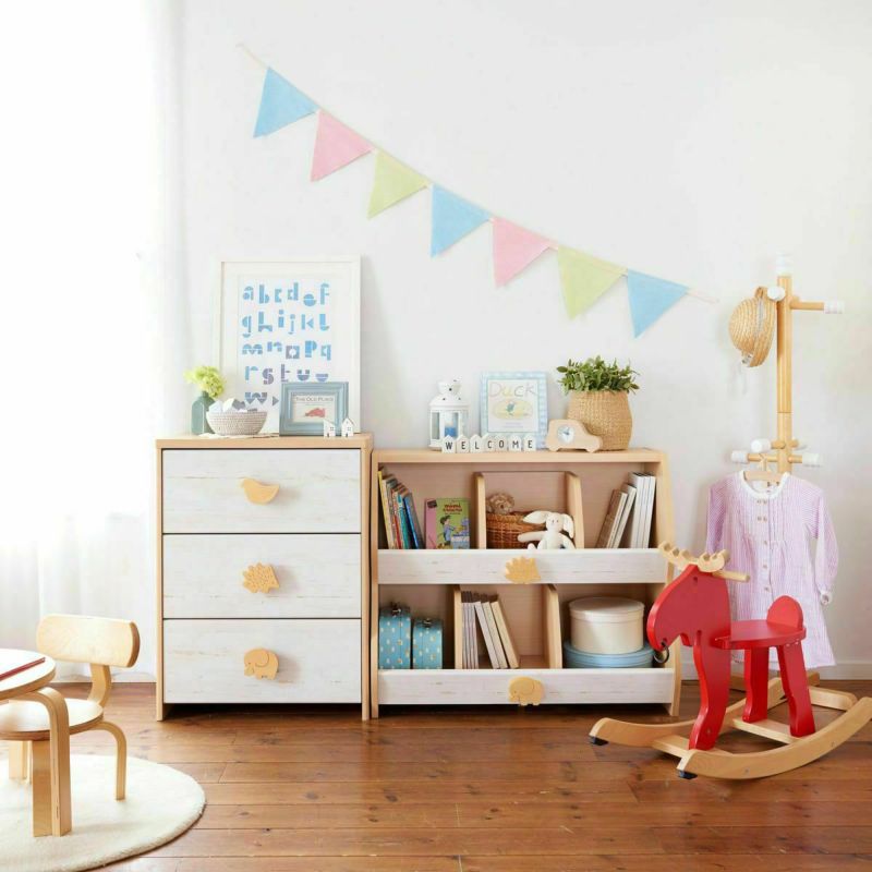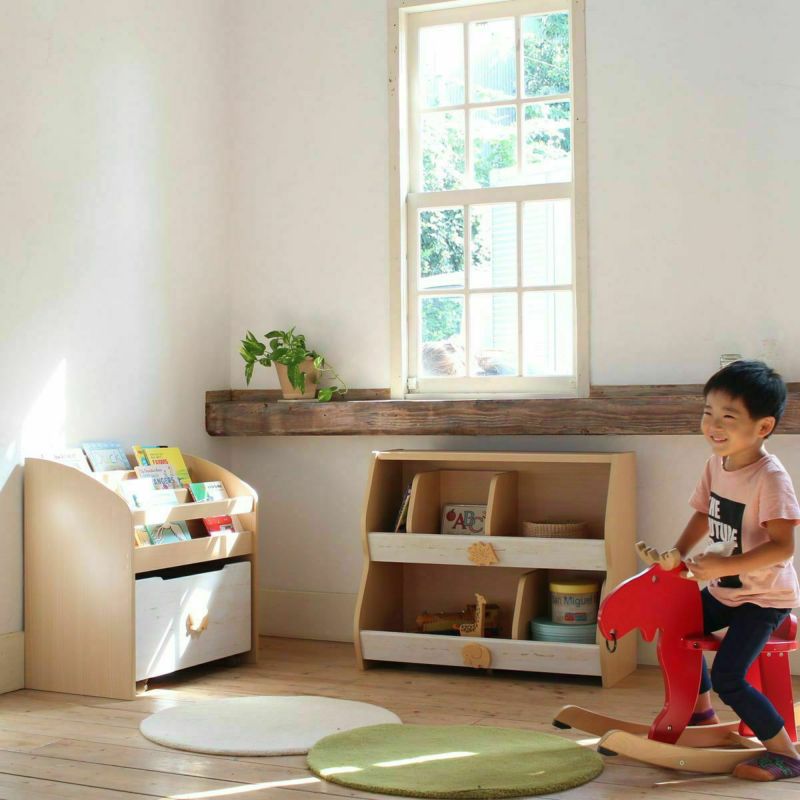 絵本やおもちゃ収納、子供服を収納できるチェストやハンガーラック、キッズデスク、ランドセルラックなど様々なキッズ収納を取り揃えています。子供の成長とともに増えたり変化したりする収納物に対応。乳児期から幼児期・学童期まで、子供が大きくなっても長く使える収納になっています。子供が収納物を見やすい・取り出しやすい高さ設計、子供の興味を引く動物モチーフなど、子供が自分で片付ける習慣づけも手助けします。シンプルだけど遊び心のあるカラーリングやデザインで、リビングのインテリアにも馴染みやすい可愛らしいキッズ家具が揃っています。