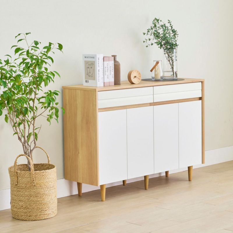 他の画像を見る お気に入りに登録する キャビネット 棚 幅120cm 高さ86cm ホワイト 白単色 ナチュラルブラウン 扉付 引出付き 50V型対応 TVボード サイドボード 収納 リビング 北欧モダン ノルフィカ NOR-8512DHWH 新着 11月21日発売予定 幅120.0 × 奥行39.2 × 高さ85.4(cm) ¥ 27,800 税込 在庫切れ