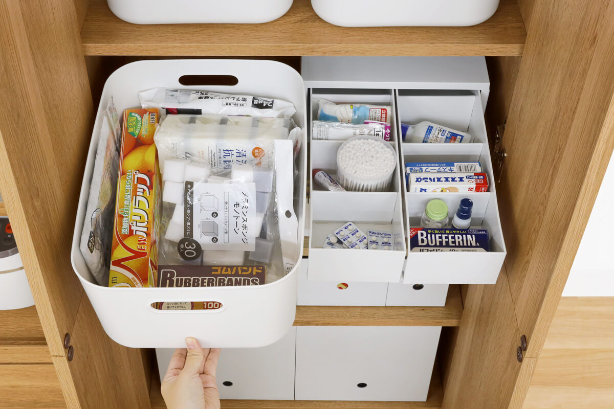 毎日飲んだり、緊急時にさっと取り出したい薬は取り出しやすい高さに収納しておきます。キッチン周りで使うスポンジ、ゴミ袋、ビニール手袋などの消耗品のストックも見やすい高さに収納すれば、在庫管理がしやすくて便利です。