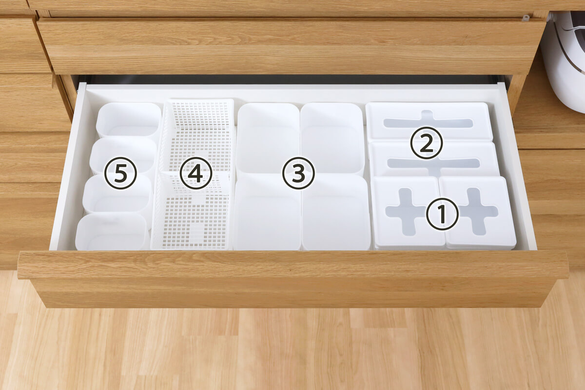 - ⑤無印良品 ポリプロピレン 小物収納ケース 中 引出2個 ホワイトグレー