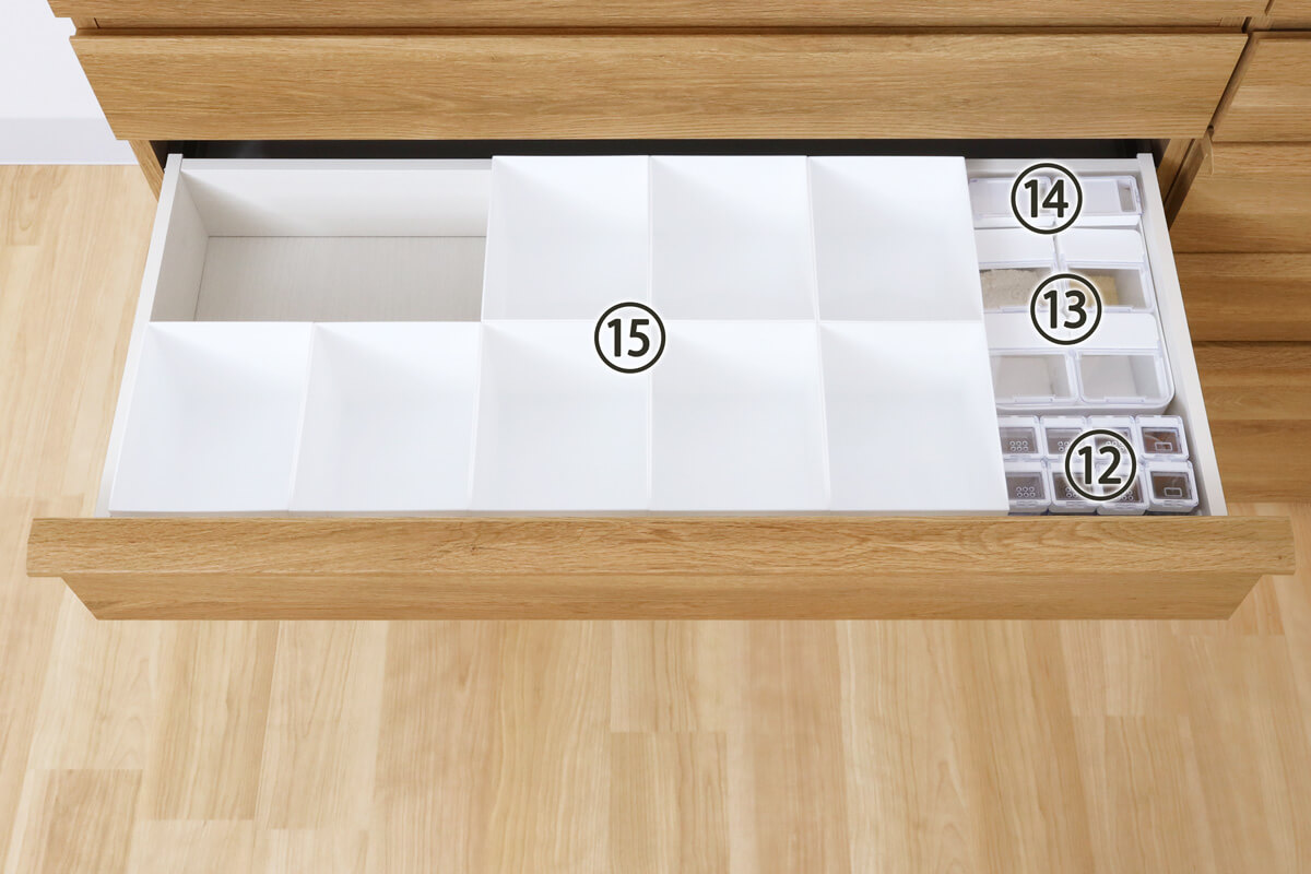 かさばる、ざるやボウル等のキッチンツールや、掃除用洗剤のボトルやスプレー、ゴミ袋などは深さのある一番下の引き出しに収納できます。ファイルボックス等を使って区切るのがおすすめです。