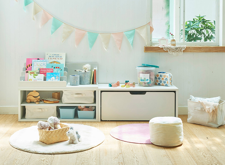 子供が小さいうちは、収納が足りなくなったり用途が変わったりと大忙し。マミハピなら、積み重ねたり並べたりと自由自在。まずはおもちゃ収納として、小学生になったらランドセルラックとして。