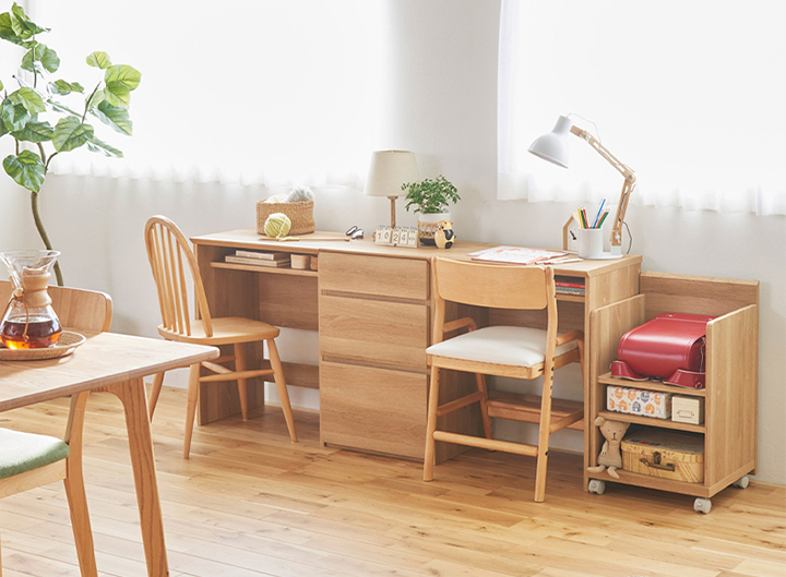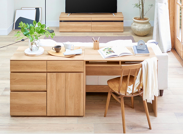 統一感のあるラインナップ。デスクと収納を揃えれば、リビングの一角が立派な書斎に。