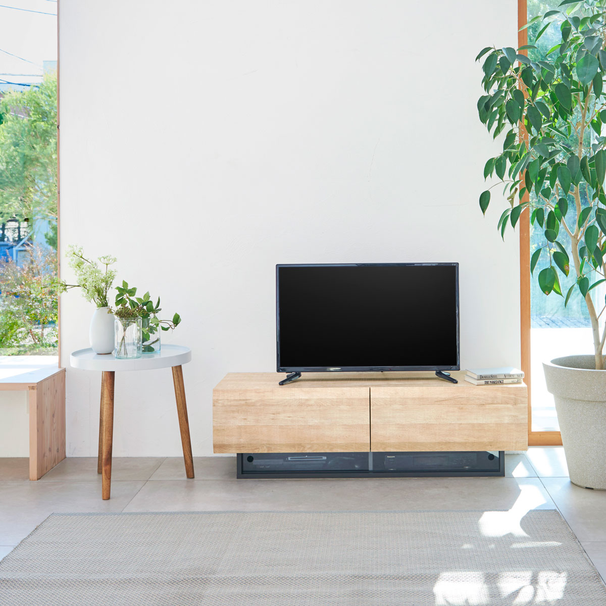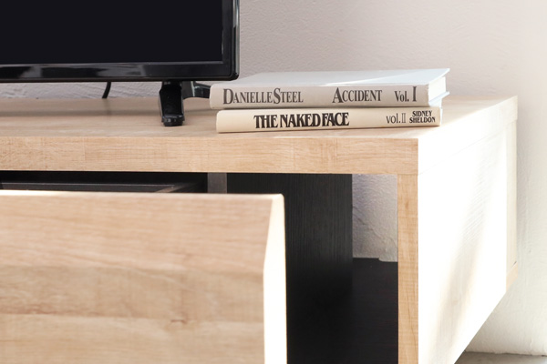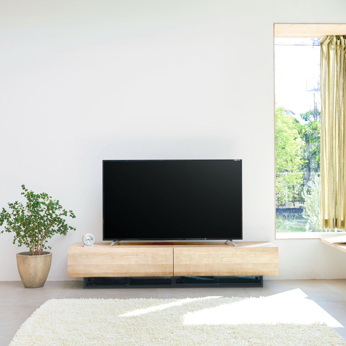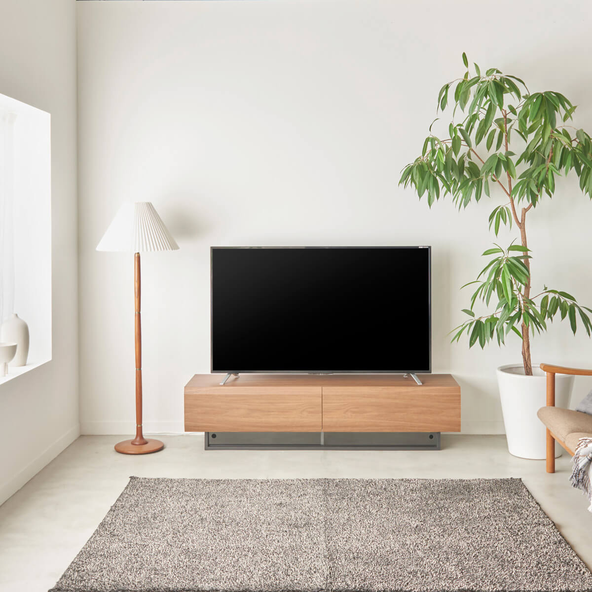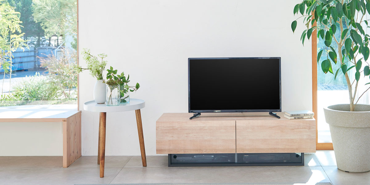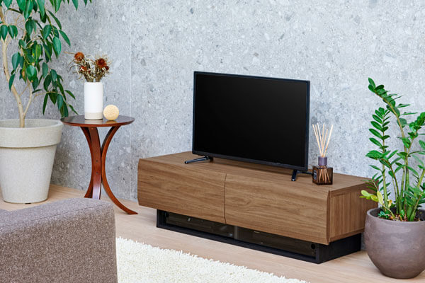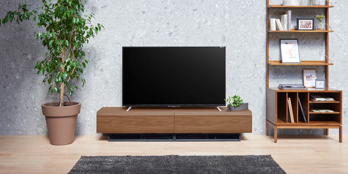 デザイン性を重視してつくられたテレビ台。シンプルさと洗練されたフォルムがテレビの顔を引き立てます。