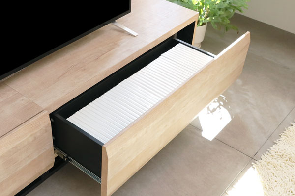 幅120㎝のテレビ台では、左側の引き出しにDVDが35枚、右側の引き出しには24枚収納できるので、合計59枚収納することができます。