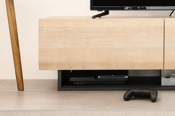 長時間ゲームをプレイする方に起こる悩みです。プレイステーションでよく起こる現象ですが、長時間ゲームをするとゲーム機本体の放熱が追い付かず、ゲーム内の反応が悪くなってしまう現象があります。シンプルなオールクローズタイプのテレビ台ほど放熱する通気口がないため、あっという間に熱暴走してしまいます。今回、そんな熱暴走を食い止めるために、AV機器収納部の後方はオープンにする設計で開発しました。