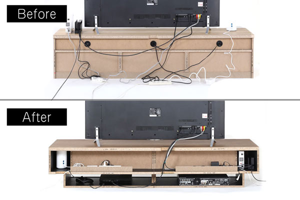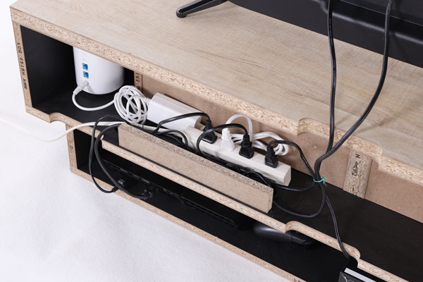 テレビ周りはテレビだけではなく、DVDプレイヤーやレコーダー、ゲーム機など様々な機器が集まります。それらから出る電源線はかなりの本数になり、テレビ台裏の配線がごちゃごちゃになってしまいます。そんな悩みを解消する仕掛けをテレビ台に施しました。
