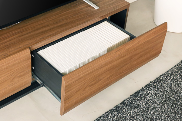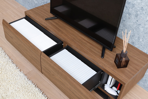DVDタイトルが見える内寸で設計を行いました。幅180㎝のテレビ台では、1つの引き出しに44枚DVDが収納でき、合計88枚収納することができます。
