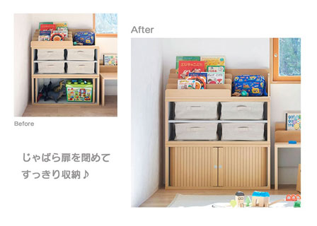 じゃばら扉ラックはおもちゃを雑に入れても扉を閉めれば見た目もすっきりおしゃれな印象になります。急な来客があっても安心です。