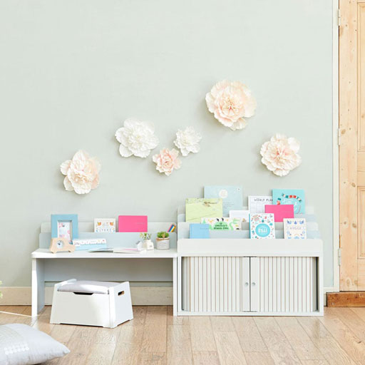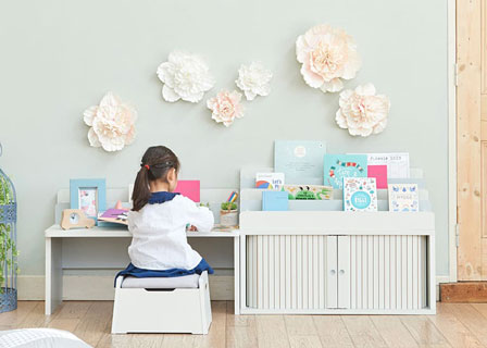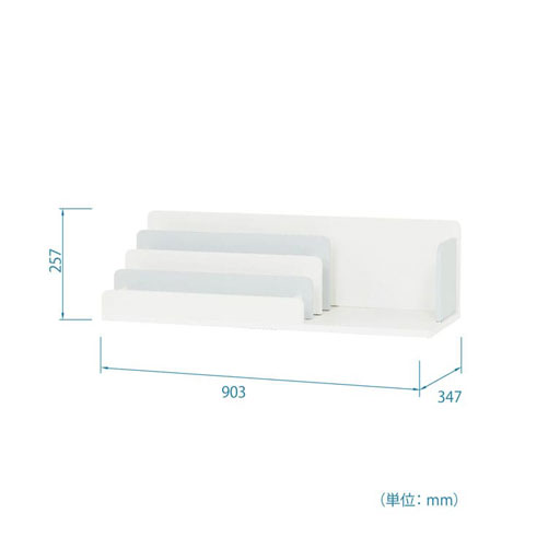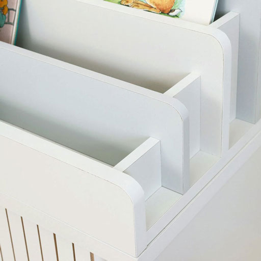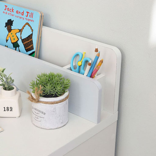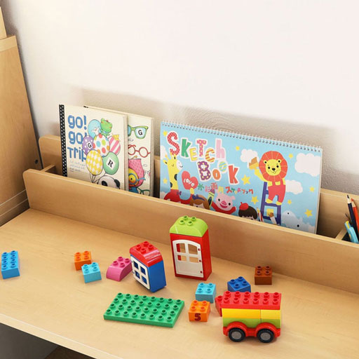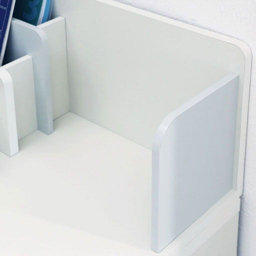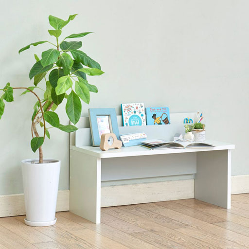 1列のラック付き。ラックにはスケッチブックや絵本、タブレットなどを収納できます。