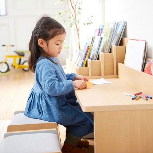 マミハピシリーズの追加購入です。 子供が1歳半になり、ピアノ絵本やシロフォンや図鑑などを目に入る所に置いて、自分で遊べるようにしたくて購入しました。高さも高すぎず丁度よく、圧迫感もないのでスペースが狭くても気になりません。スツールとセットで使用してますが、毎日楽しそうに机の前に座っています。絵本棚とラックと繋げて使用してます。自分で好きな物を選んで遊べるのと、デザインもシンプルでおしゃれです。組み立てる必要がありますが、簡単ですぐにできるのでおすすめです。 -