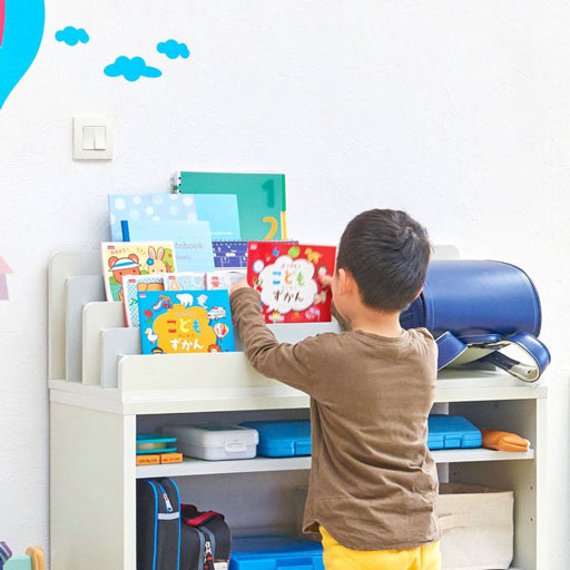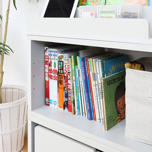 絵本ラックは表紙を見せて収納するタイプ。表紙が見えることで色や絵柄から、子供が読みたい本・読んでほしい本を自分で選びやすくなります。また、両手でつかめるから子供の小さい手でも取りやすくなります。自分で持ってくる、自分で片付ける習慣をうながすことができますよ。