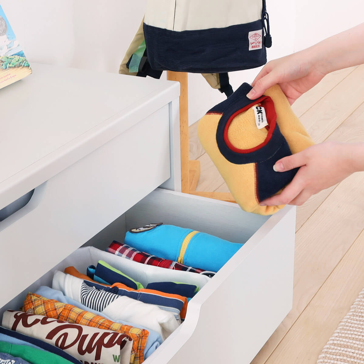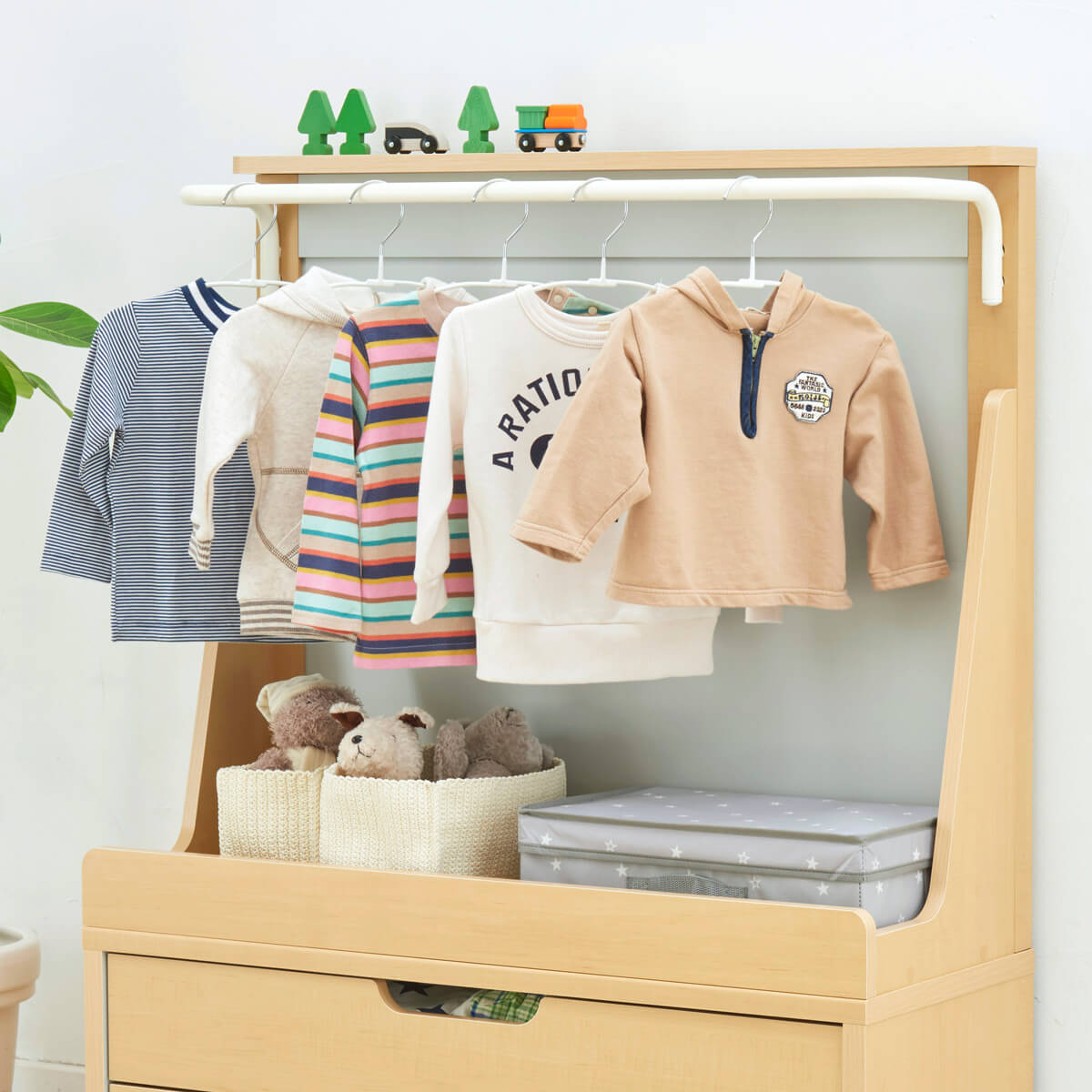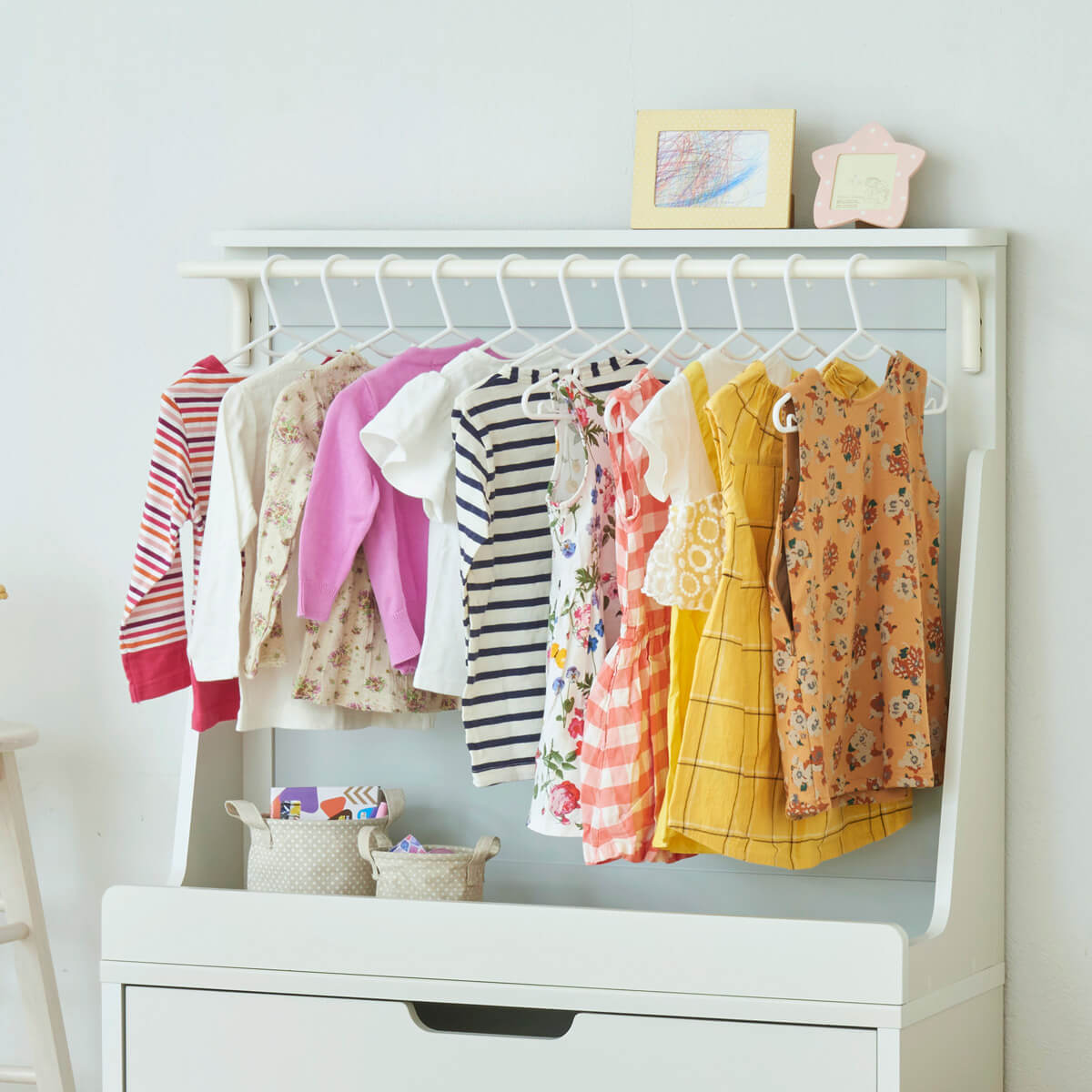 子供の上着や制服・ワンピースなどは、大人と同じクローゼットに収納しているご家庭も多いと思います。子供用のハンガーラックで子供でも目につく場所に収納することで、自分で選んだり自分で取ったりすることができます。チェストと組み合わせて使えば下着やTシャツなども1か所にまとめて管理できるから身支度も楽々です♪