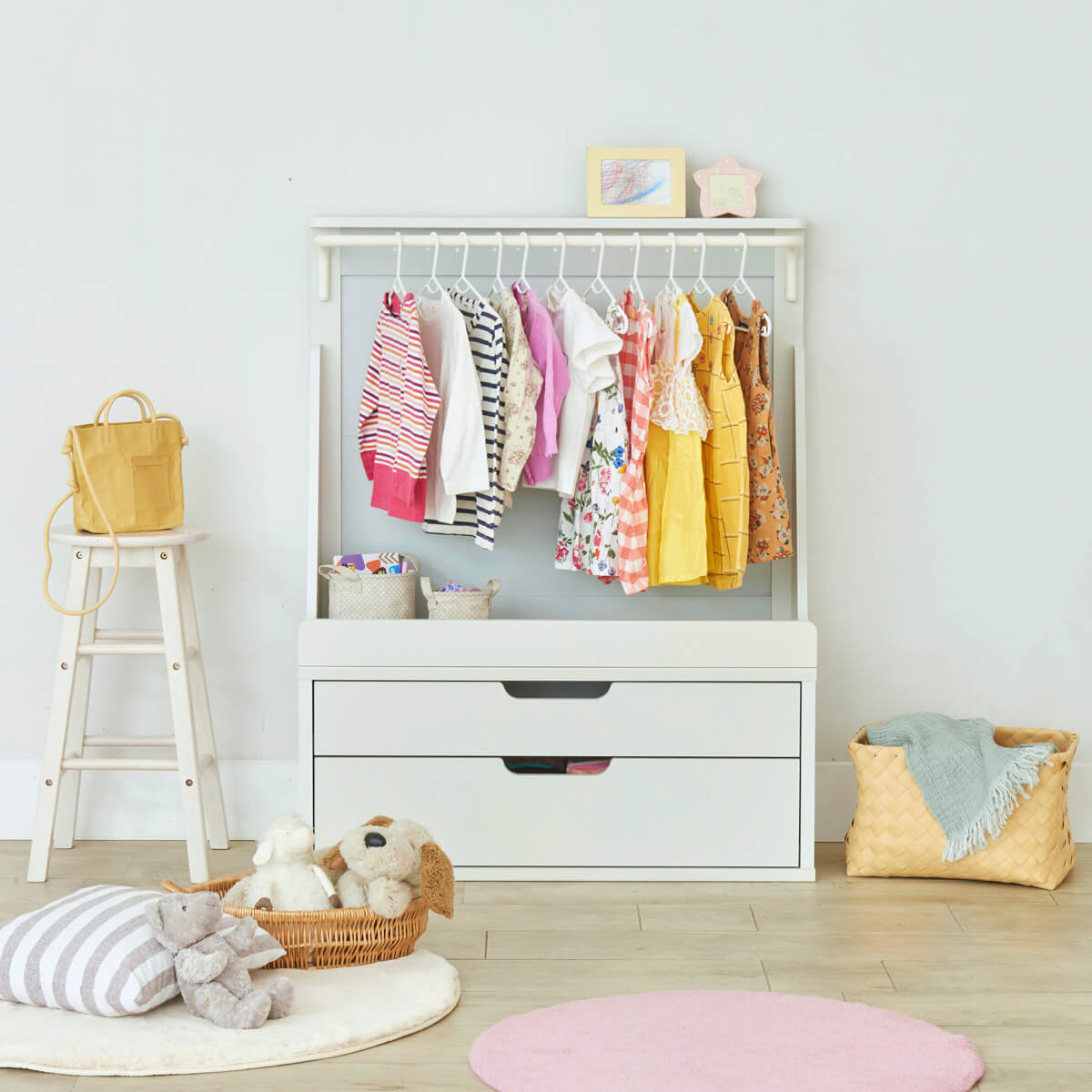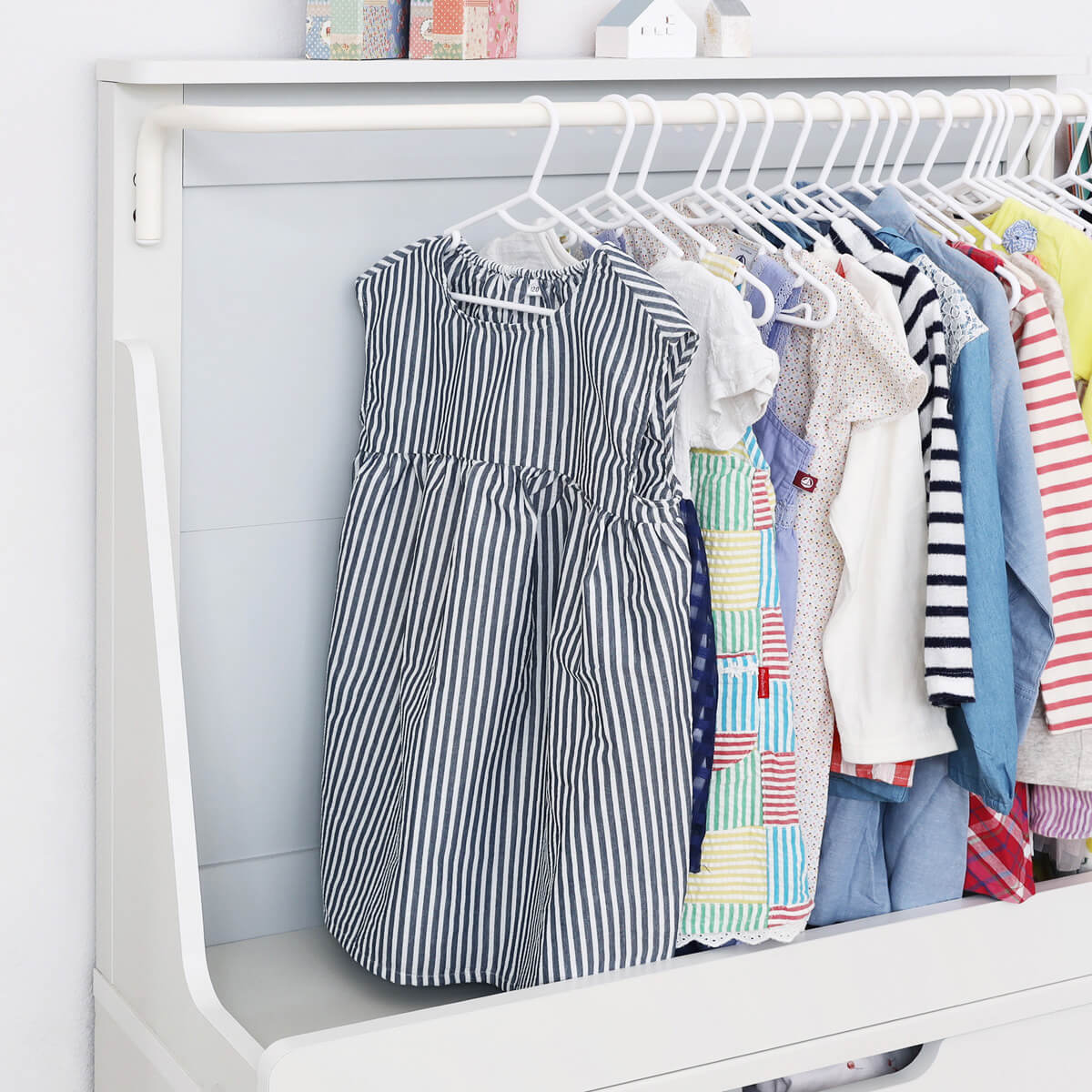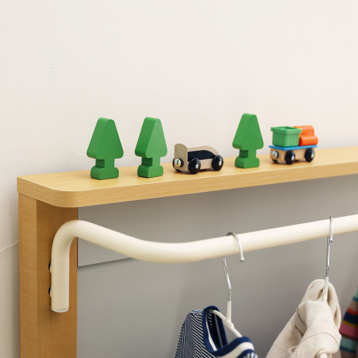 子供の上着や制服・ワンピースなどは、大人と同じクローゼットに収納しているご家庭も多いと思います。子供用のハンガーラックで子供でも目につく場所に収納することで、自分で選んだり自分で取ったりすることができます。チェストと組み合わせて使えば下着やTシャツなども1か所にまとめて管理できるから身支度も楽々です♪