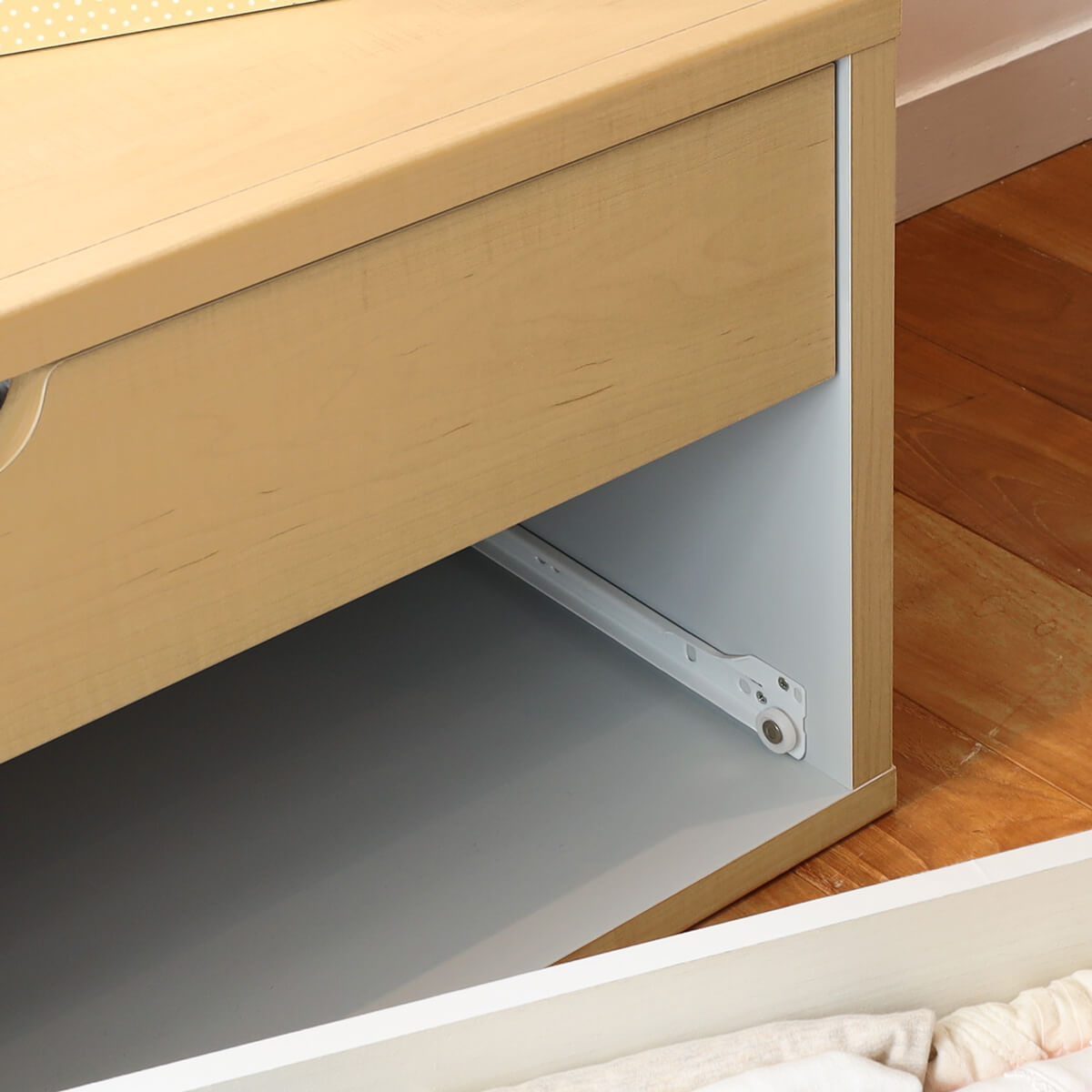 本体の内側は明るいグレーカラー。引き出しの隙間からのぞくグレーが、子供らしい遊び心を持たせたデザインです。