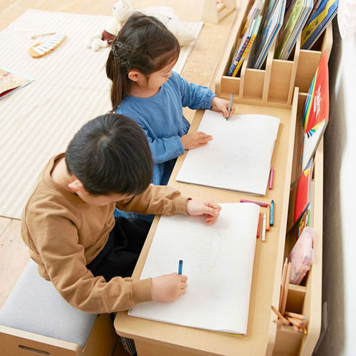 横に広い机なので、工作グッズをたくさんひろげて使えます。きちんと座って迷路やお絵描きをしてくれて、落ち着いて勉強をする練習になりそうです。 -
