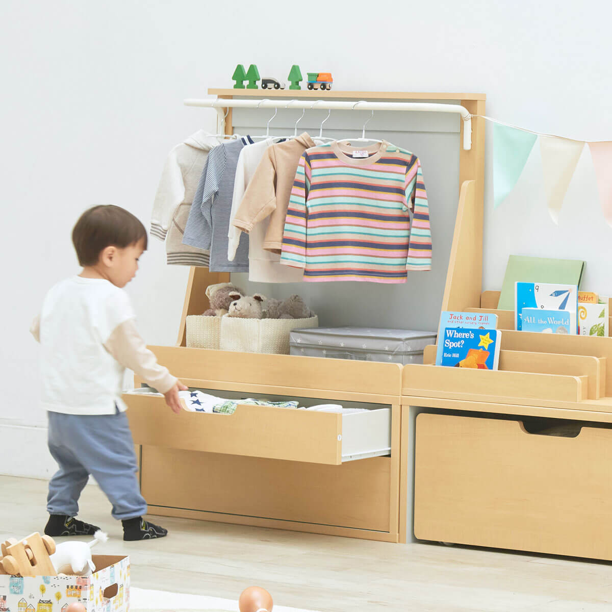「絵本」「おもちゃ」「子供服」をたっぷり収納できるサイズ設計