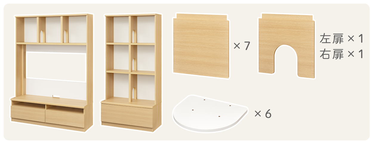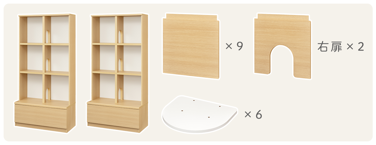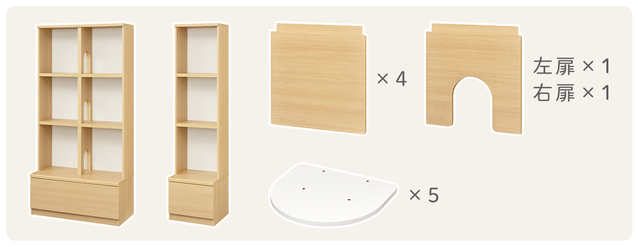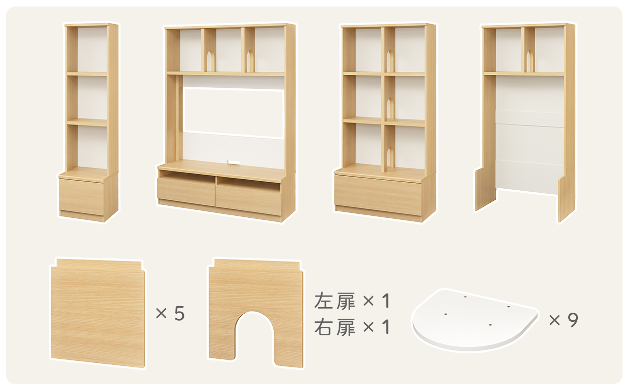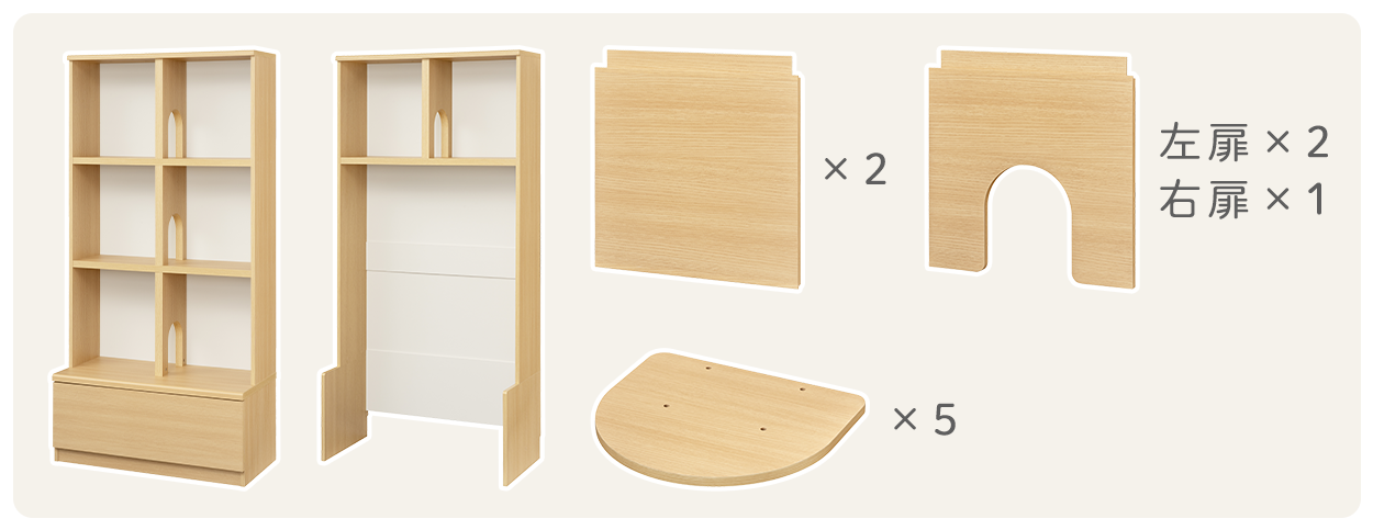 「愛猫が思いっきり遊べるスペースにしたい!」「モノが多いから収納スペースがたくさん欲しい!」など、ご家庭によって様々。ニャコモは扉やステップをどの位置にも取り付けができるから、取り付ける位置と数を自由に決めることができます。