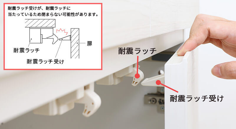扉が上がり過ぎている為に、耐震ラッチ受けが耐震ラッチにあたってしまう事があります。その場合は扉(ワンタッチヒンジ・スライド蝶番)の調整方法を参考に、扉を下げてみてください。