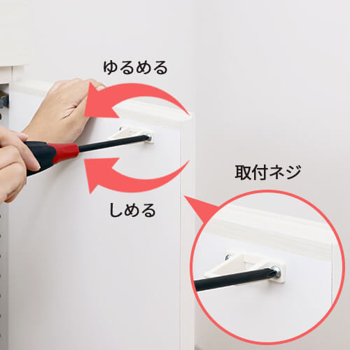 扉側の耐震ラッチ受けの取り付けネジを緩め、耐震ラッチ受けを少しずつ下げて扉が閉まる位置まで調整してください。
