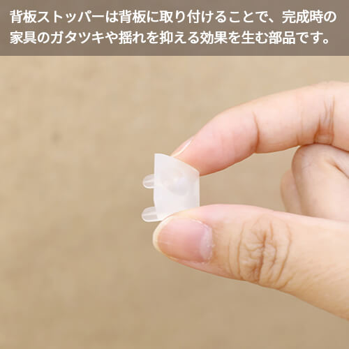 背板ストッパーは背板に取り付けることで、完成時の家具のガタツキや揺れを抑える効果を生む部品です。