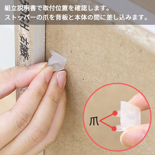 ストッパーの爪を背板と本体の間に差し込みます。