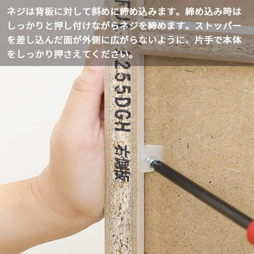 ネジは背板に対して斜めに締め込みます。締め込み時はしっかりと押し付けながらネジを締めます。ストッパーを差し込んだ面が外側に広がらないように、片手で本体をしっかり押さえてください。